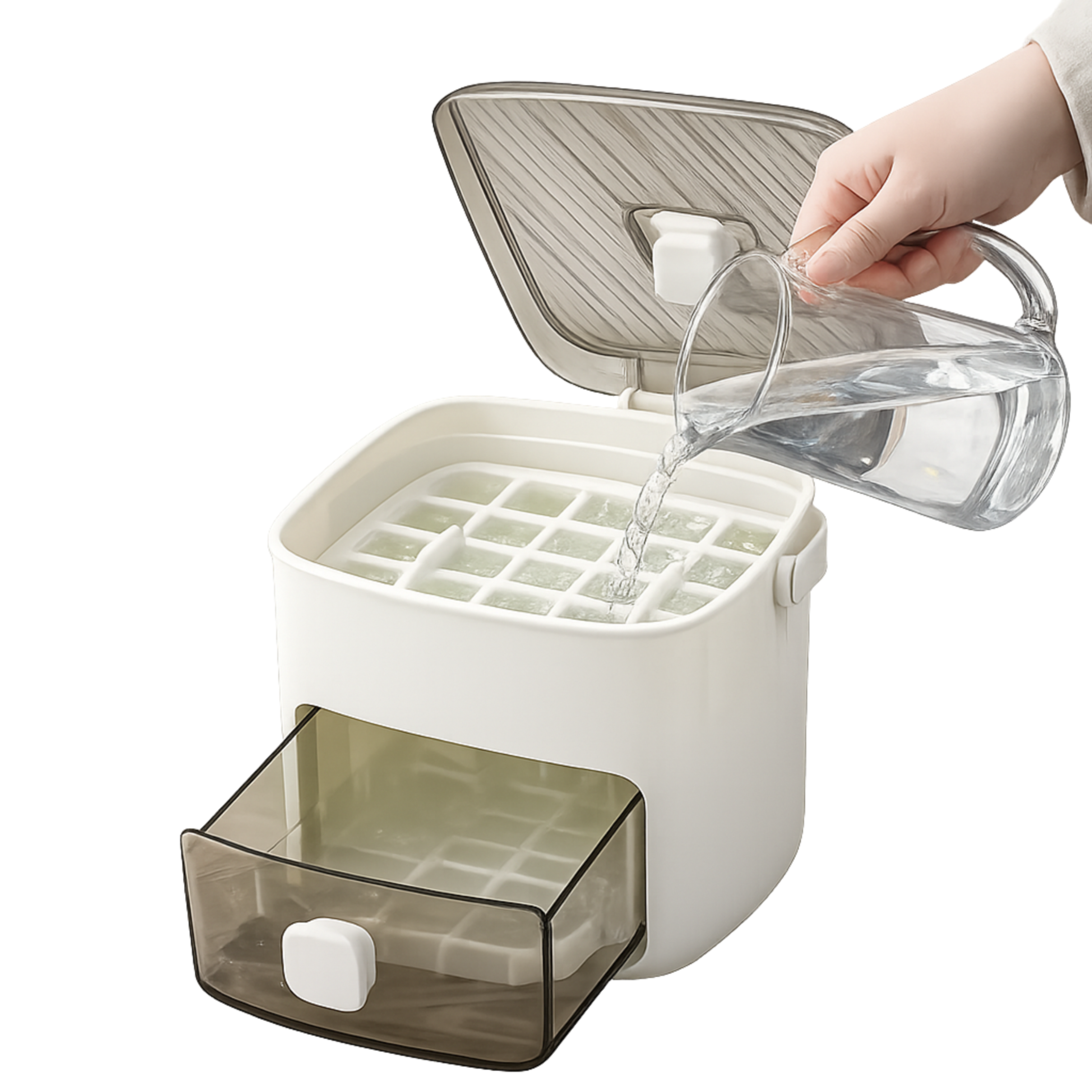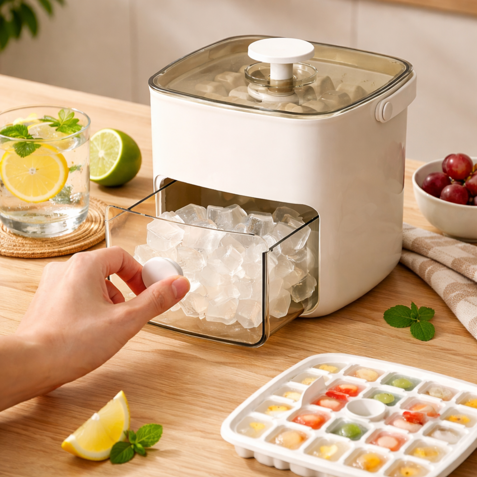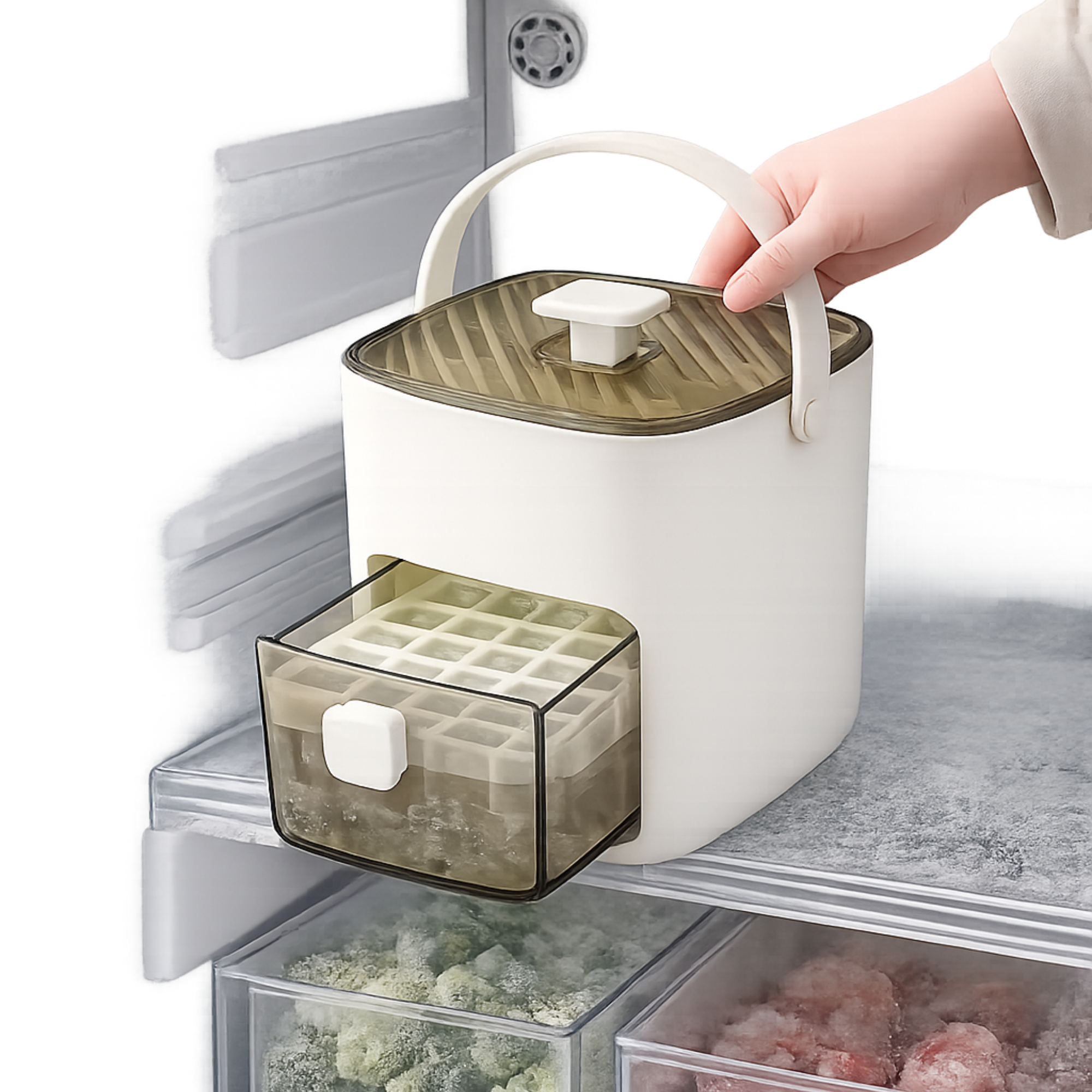 Produce hasta 48 cubitos uniformes de una sola vez con un sistema de liberación por compresión que elimina la fuerza manual. Su diseño vertical de doble nivel con cajón integrado acelera la congelación, ahorra espacio y mantiene el hielo puro, sin olores ni BPA. ❄️